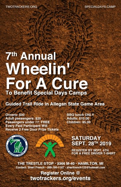 Join the Two Trackers Four Wheel Drive Club for the 7th Annual Wheelin’ for a Cure on September 28, 2019. The 7th Annual Wheelin’ for a Cure is a event to help send Children dealing with cancer and their Siblings to Special Day’s Camp so they can “Just be Kids” for a change. Camp gives […]